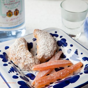 Countless recipes for rich little cookies like these exist, and most cultures have their versions. Most of them are little round balls rolled in powdered sugar, but these take the shape of a crescent. Because it’s that time leading up to Easter, I thought I’d share with you the version that Greeks might be eating during this Lenten season. (Another version that I’ll maybe share with you later includes eggs, butter and Ouzo!) This one calls for margarine, though I always use butter in cookies. The addition of olive oil and orange juice, as well as almond extract, make these distinctly different and delicious.