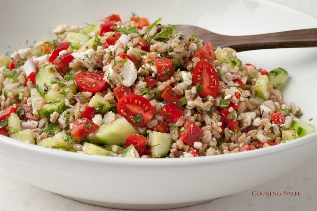 This refreshing salad, with its bright, fresh herbs, crisp cucumber and sweet red bell pepper, its chewy farro, and bits of salty feta, tastes like summer! It can be the central part of a vegetarian meal, or a side dish for roasted or grilled chicken, or grilled salmon.