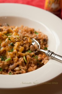 From down south in New Orleans there comes a Cajun dish of black-eyed peas and rice, traditionally served on New Year’s Day. Hoppin’ John they call it. Eaten on the first day of the new year, it’s purported to bring good luck for the remainder. I figure when something tastes this good, it’s bound to be lucky! Most often made with ham and bones, this is a vegetarian version – don’t be dissuaded you meat-eaters – it’s brimming with smoky flavor from smoked paprika and chipotle peppers in adobo sauce.  (Now you see where the smokin‘ comes from.)