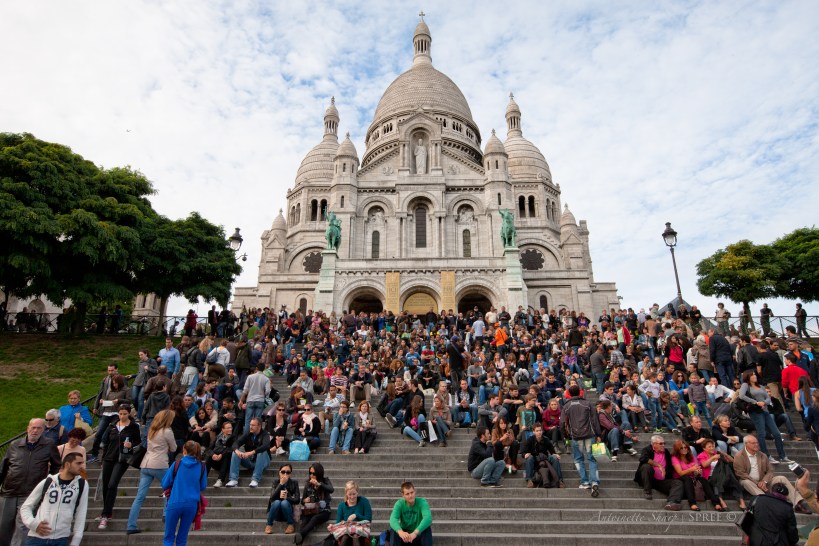 At the top of the hill sits the cathedral, Sacre Coeur (Sacred Heart). On the steps in front sat a colorful band of travelers who’d made the climb. Theirs was the perfect vantage point to see the sun as it set over Paris. We heard music. We looked at each other. It can’t be. But it was.