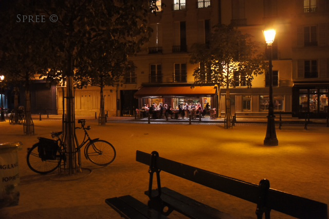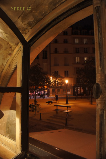We walked the footbridge cross the Seine to the left bank. There we had dinner in a restaurant that felt 500 beautiful years old. (It couldn’t have been much less than that.) Our table, in front of an open 2nd story window looked onto Place Dauphine, this one lovely unforgettable night!